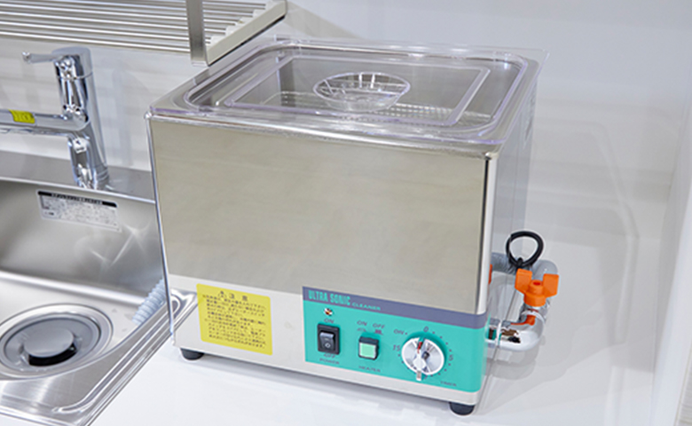 超音波を発生させ、その振動で血液やタンパク質などの汚れを落とします。